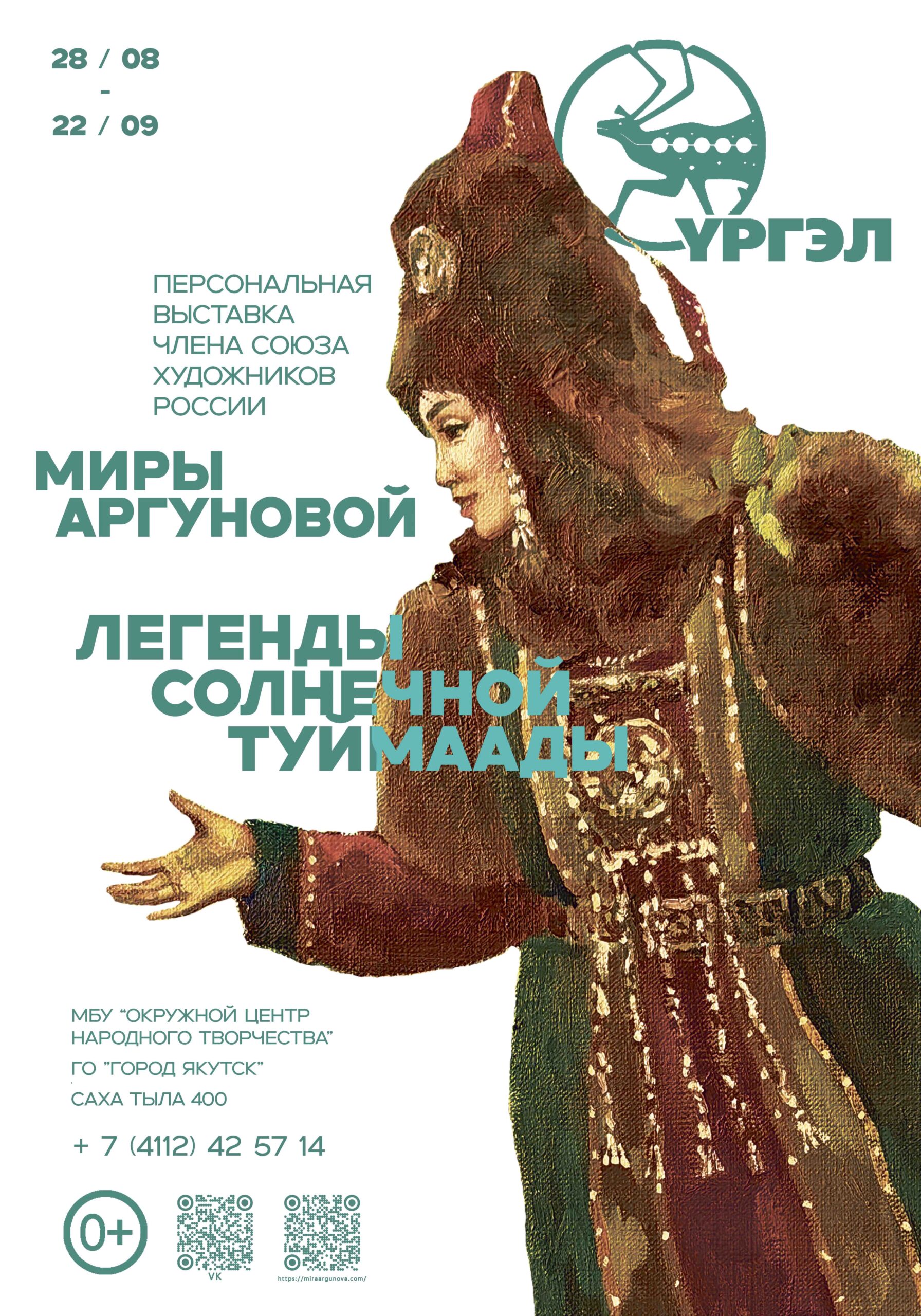 Выпускник-наставник АГИКИ, член Союза художников России, отличник культуры Республики Саха (Якутия), лауреат Национальной премии «Страну меняют люди» Мира Аргунова приглашает на выставку серии картин «Легенды солнечной Туймаады», которая состоится в арт-галерее «Ургэл» 28 августа.
