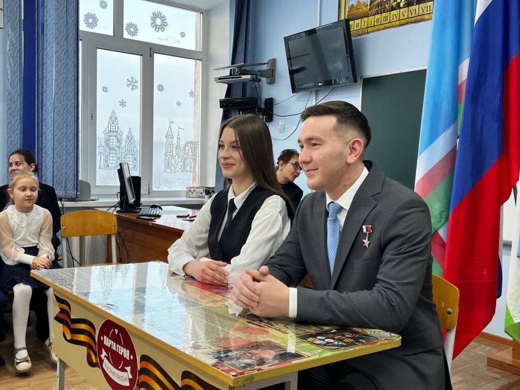 4) В конце 2024 года вместе с Героем России Игорем Васильевичем Юргиным открыли парту Героя в нашей Гимназии.