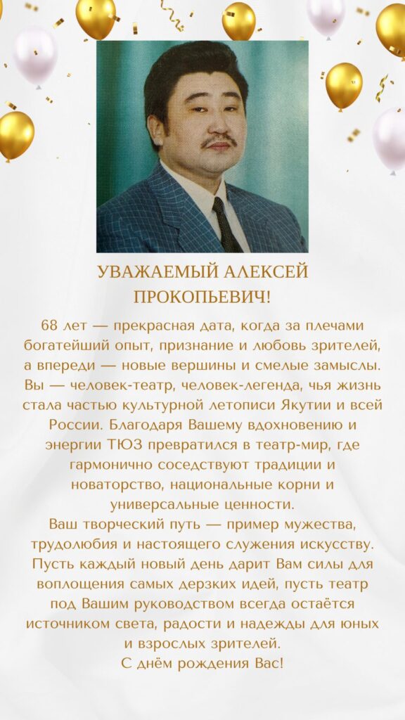 Алексей Прокопьевич — это имя, которое неразрывно связано с театральной жизнью Якутии. Уже более сорока лет он посвятил себя сцене, став не только выдающимся актёром и режиссёром, но и мудрым наставником для целого поколения артистов. Под его руководством ТЮЗ вышел далеко за пределы республики, с успехом представляя своё искусство на международных и российских театральных фестивалях.