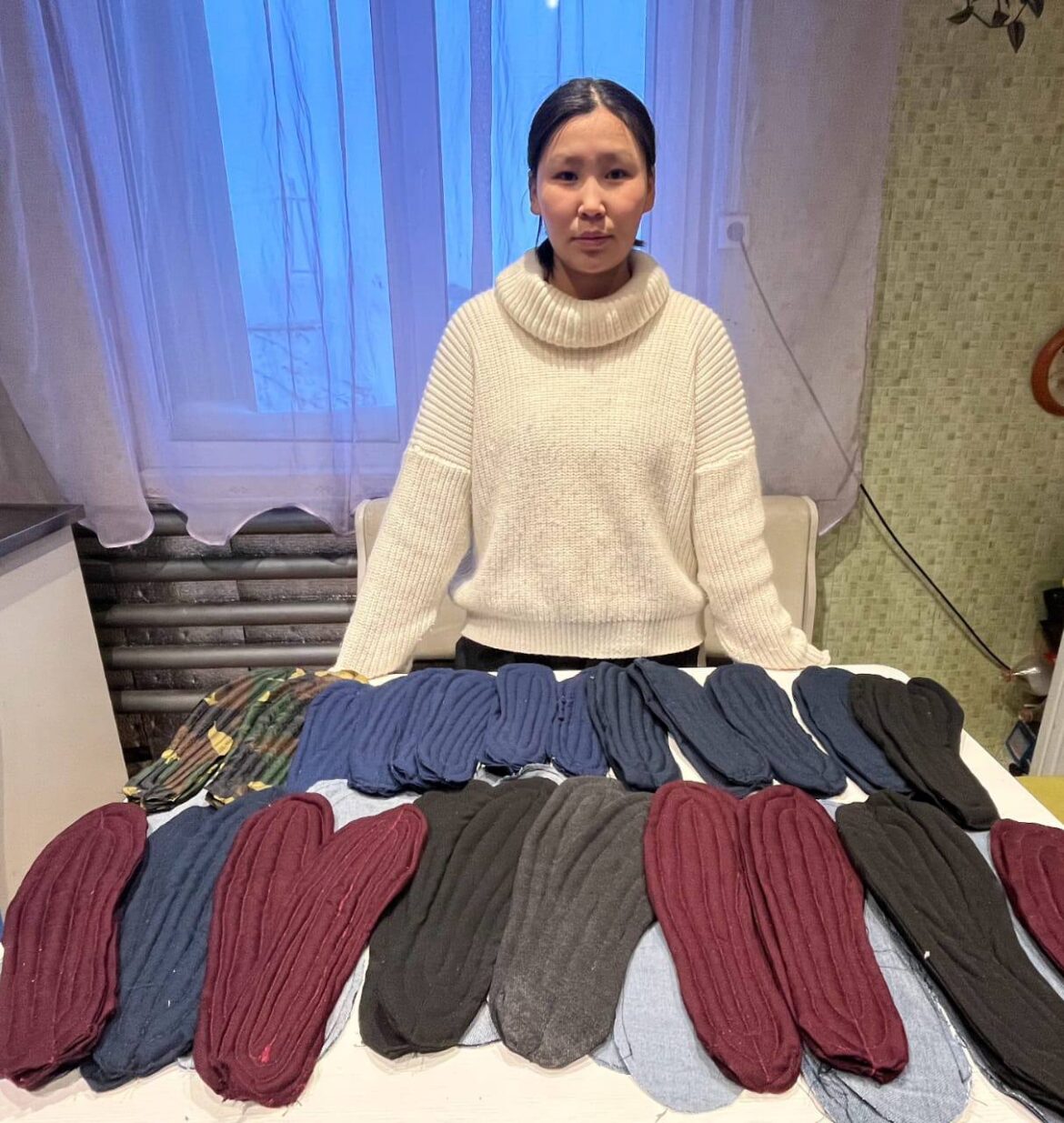 Ол Г.Г.Софронов аатынан Орто Халыма улууһун Өлөөкө-Күөл оскуолатын 9-ус кылааһын үөрэнээччитэ Сухомясова Элеонора буолар. Кини 40 көппөх угунньаны тигэн АБДь сылдьар саллааттарга ыытта. Ол туһунан Эля маннык кэпсиир: