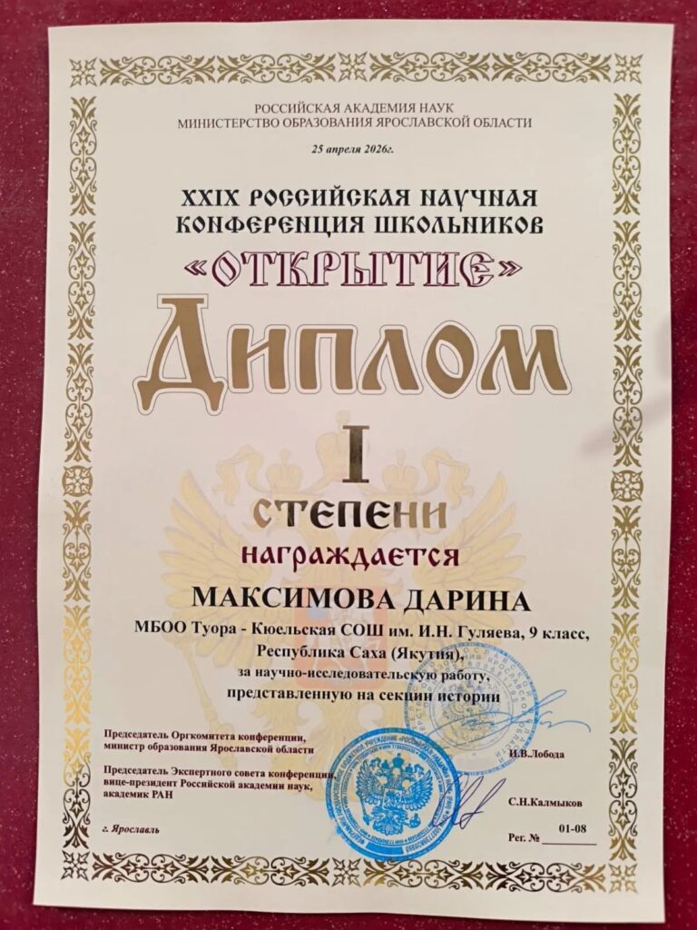 Саха Өрөспүүбүлүкэтин күнүгэр Ярославль куораттан үөрүүлээх сонуну туттубут. Таатта улууһун И.Н. Гуляев аатынан Туора Күөл орто оскуолатын 9-с кылааһын үөрэнээччитэ Дарина Максимова улахан ситиһиилэннэ. Кини Ярославль куоракка ыытыллыбыт «Открытие» Арассыыйатааҕы XXIX научнай конференцияҕа «История» секциятыгар 43 оҕо кыттыбытыттан кыайыылаах үрдүк аатын ылла, 1 степеннээх дипломунан, мэтээлинэн наҕараадаланна.