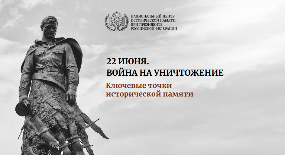 Национальным центром исторической памяти при Президенте Российской Федерации подготовлены информационно-справочные материалы «22 июня. Война на уничтожение. Ключевые точки исторической памяти». Они показывают подлинную сущность вероломного нападения нацистской Германии на СССР 22 июня 1941 года как целенаправленной войны на уничтожение.