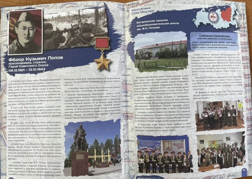– Российскай Федерация үөрэҕэриитин министиэристибэтэ, “Росдетцентр” федеральнай тэрилтэ “Навигаторы детства” бырайыакка үлэлиир дириэктэри иитэр үлэҕэ сүбэһиттэр быһаччы көмөлөрүнэн бу кинигэ бэчээттэнэн таҕыста. Манна Арассыыйа 89 регионуттан 89 Герой историята түмүллэн киирдэ. Инньэ гынан бу кинигэ Арассыыйа 89 регионугар тарҕанна. Биһиги өрөспүүбүлүкэбититтэн бастакы Геройбут Федор Кузьмич Попов туһунан киирдэ. Онон билигин 89 региоҥҥа кини туһунан билэ—көрө, ааҕа сылдьаллар. Бу кини аатын үйэтитиигэ биһиги сэмэй кылааппыт буолар, – диэн кэпсээтэ.