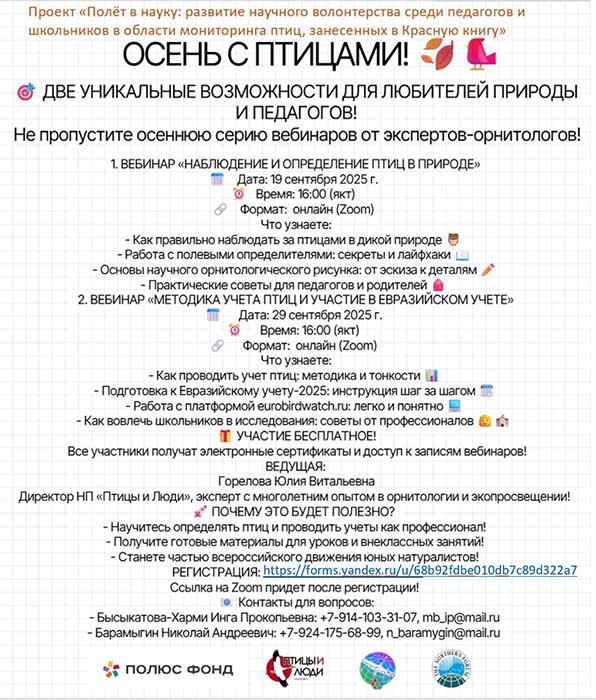 Не упустите шанс стать частью увлекательного орнитологического приключения! Присоединяйтесь к нашим вебинарам и узнайте больше о мире птиц!