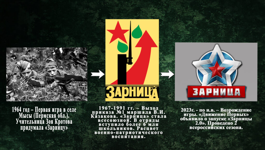 История Зарницы началась в 1964 году в селе Мысы Пермской области, когда учительница Зоя Васильевна Кротова придумала правила и провела первую игру для детей.