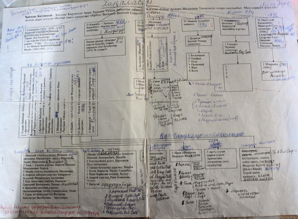 В ходе работы над исследованием я решил изучить историю своего рода и составить представление о предках, основываясь на уже существующем генеалогическом древе, которое хранится в краеведческом музее «Дьөһөгөй оҕото» села Хаты Нюрбинского района. Это древо включает 12 поколений и является важным историческим документом, отражающим судьбы многих семей. О существовании древа я узнал от своей бабушки, которая по работе посетила этот музей. Она с удивлением обнаружила на древе имя своей бабушки, а музейный работник рассказал ей подробнее о родственных связях и людях, включенных в это древо. Этот случай стал началом моего интереса к истории нашей семьи. Кроме того, в нашей семье есть моя двоюродная прабабушка. Ее зовут Васильева Мария Васильевна, она ветеран труда, почетный гражданин Нюрбинского района, почетный старейшина Республики Саха (Якутия), ей 92 года. Она на протяжении многих лет самостоятельно занимается изучением родословной, ведет записи в таблицах, отмечая кто кому приходится, стараясь сохранить эти сведения для потомков. На свой 90-летний юбилей, Мария Васильевна поделилась своими архивами с детьми и племянниками. Ее записи стали для меня ценным источником и примером того, как важно сохранять память о своем роде.
