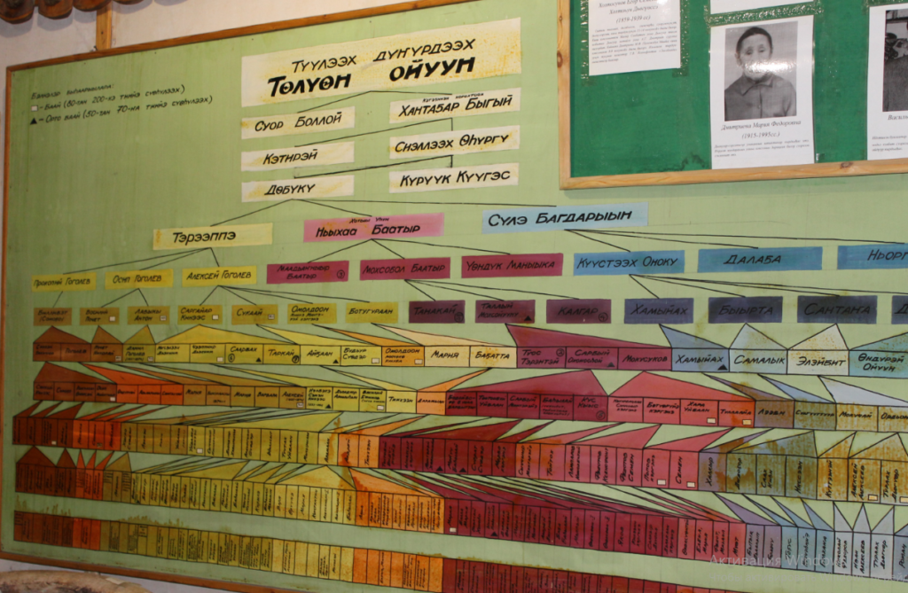 Мегежеский наслег издревле из уст в уста хранит свою память и ведет свою родословную. Иван Яковлевич Танхаров — человек который изучил все эти рассказы, и объединил в одну таблицу, на основе которых было созданы генеалогические древа, представленные для взора посетителей музея. Всего существовало более десяти отцовских рода, из них самый большой род — потомки Туулээх Дунурдээх Тулуен Ойуун. В этом древе я являюсь 16-м поколением (Приложение 1). Если считать, что средняя продолжительность одного поколения — это 25 лет, то продолжительность жизни всего древа — это около 400 лет.