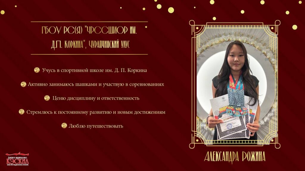 Кинилэр ортолоругар мин биир дойдулааҕым Д.П. Коркин аатынан Чурапчытааҕы спортивнай оскуола 11-с кылааһын үөрэнээччитэ Александра Рожина баар.