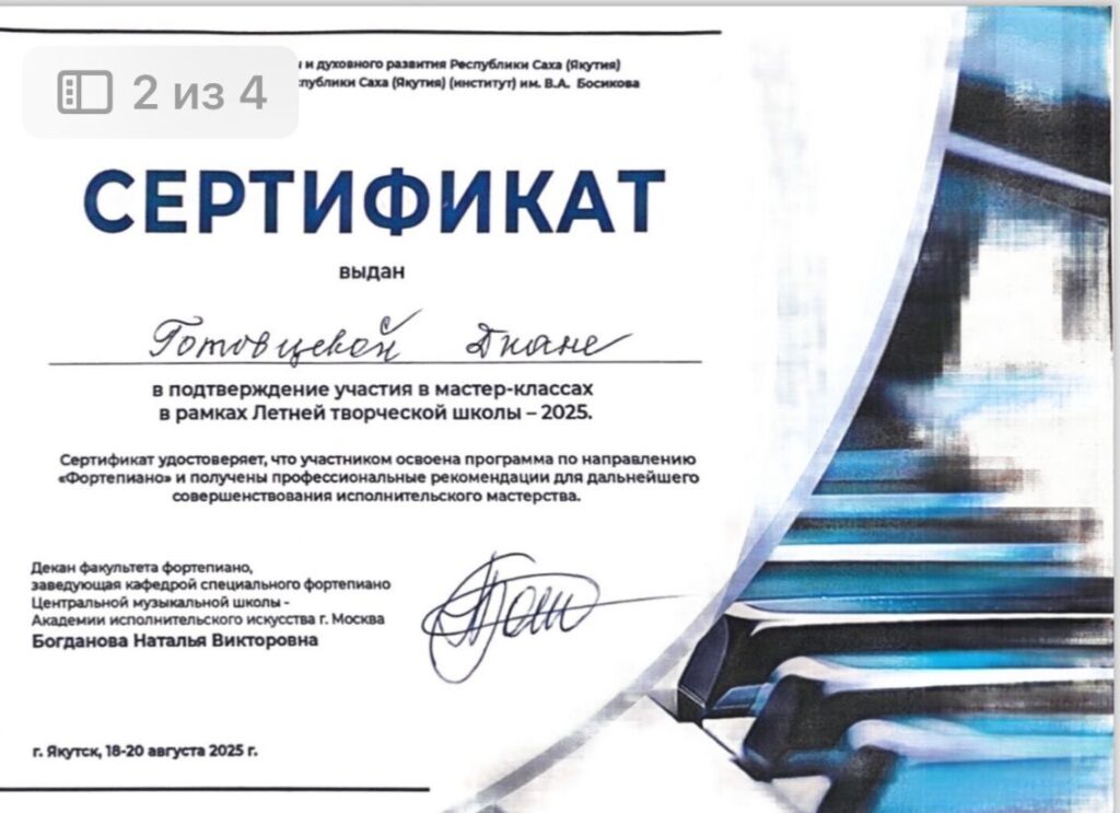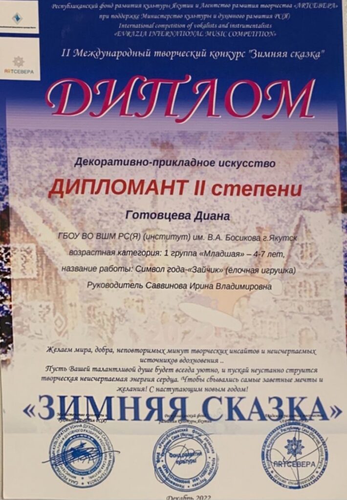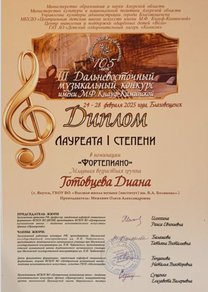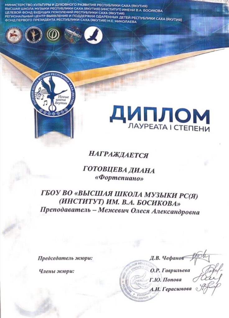 Одним из моих первых больших достижений стало то, что я стала победительницей в своей группе самого престижного конкурса нашей республики «Новые имена Якутии». Затем я приняла участие в Дальневосточном музыкальном конкурсе имени М.Ф. Кнауф-Каминской в г. Благовещенске, где также стала лауреатом I степени и впервые получила премию в размере 10 000 рублей!