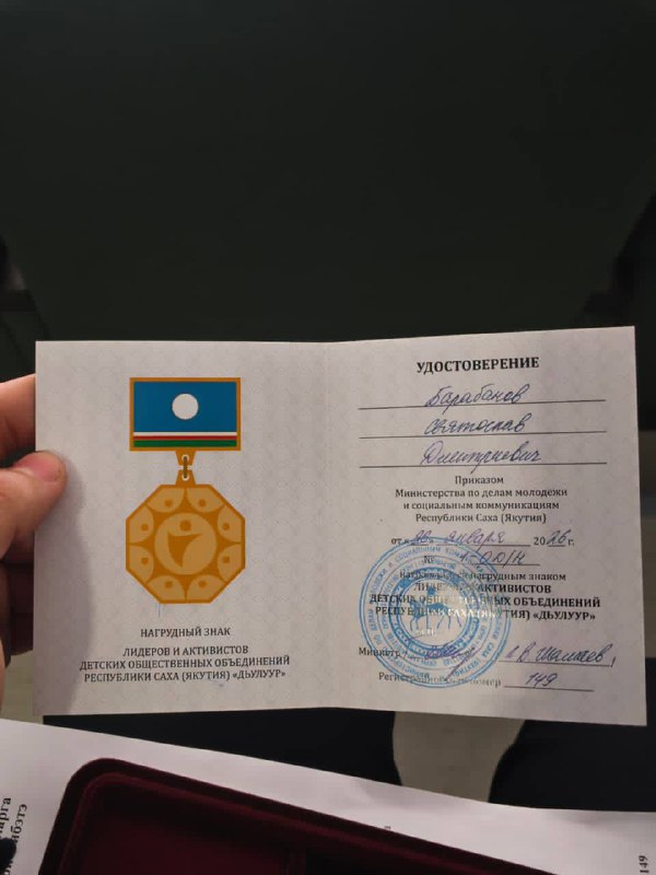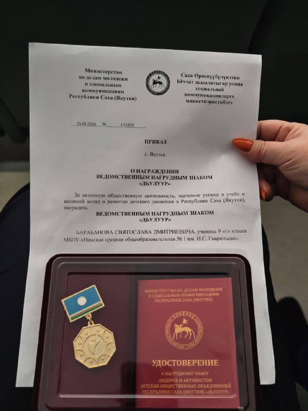 Я, Святослав Барабанов, юнкор детского издательства «Кэскил», ученик 9 класса МБОУ «Намская СОШ №1 им. И.С. Гаврильева», с огромным удовольствием поздравляю всех с получением нагрудного знака «Дьулуур»! Этот знак вручается Министерством по делам молодёжи и социальным коммуникациям Республики Саха (Якутия) за активную общественную деятельность в рамках детского движения республики, а также за успехи и достижения в республиканских, всероссийских и международных конкурсах, форумах и фестивалях. Я невероятно горжусь тем, что меня выбрали среди представителей Намского улуса.