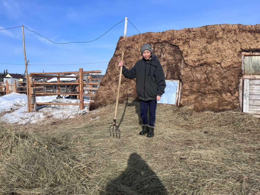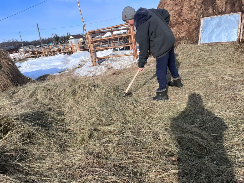 -Тыа сиригэр олорор дьон үксэ сүөһү, сылгы иитэллэр. Оҕолор хайаан да төрөппүттэрбитигэр дьиэ сүөһүтүн көрөргө көмөлөһөлөбүт.Мин бырааппын Андрейы кытта эмиэ эбэбэр, эһэбэр көмөлөһөммүн сүөһү уулатабыт, кууруссалары аһатабыт. Сылы эргиччи сибиэһэй этинэн-үүтүнэн аһыыбыт.Оҕолору хаһаайыстыба үлэтигэр сыһыарыы эппиэтинэһи, бэйэни салайыныыны уонна туһалаах үөрүйэхтэри үөскэтэр дии саныыбыт.