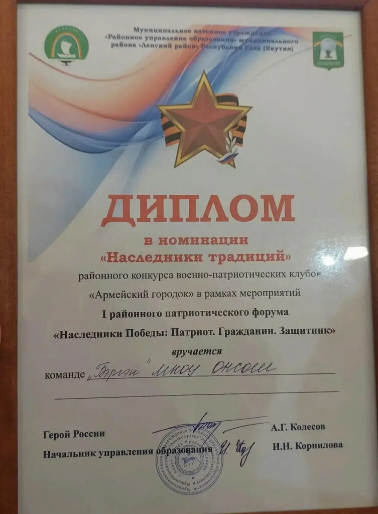 По итогам районного конкурса военно-патриотических клубов «Армейский городок», прошедшего в рамках I районного патриотического форума «Наследники Победы: Патриот. Гражданин. Защитник», школьный патриотический отряд «Бэргэн» был награждён Дипломом в номинации «Наследники традиций». Эта награда стала признанием активной работы отряда по сохранению и продолжению лучших традиций патриотического воспитания.