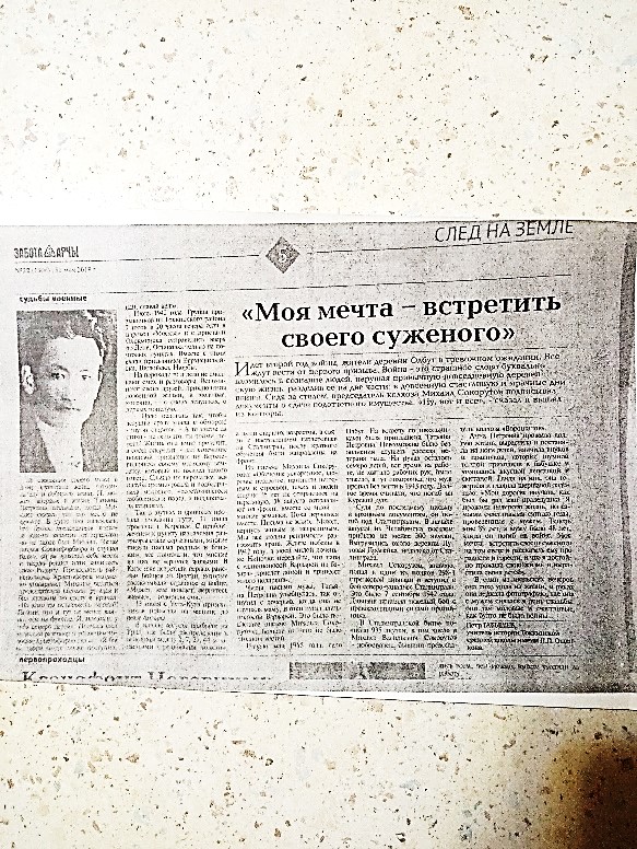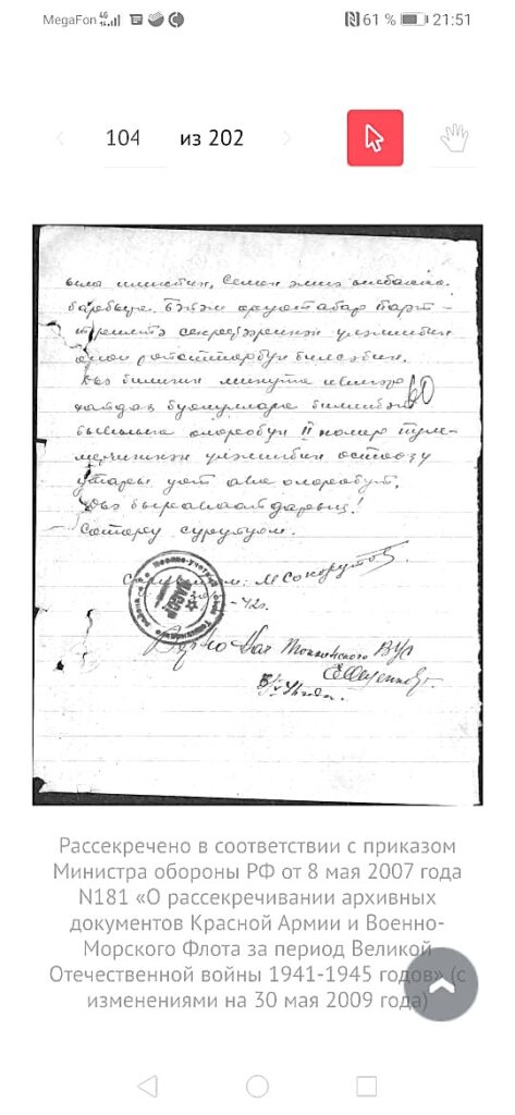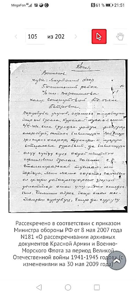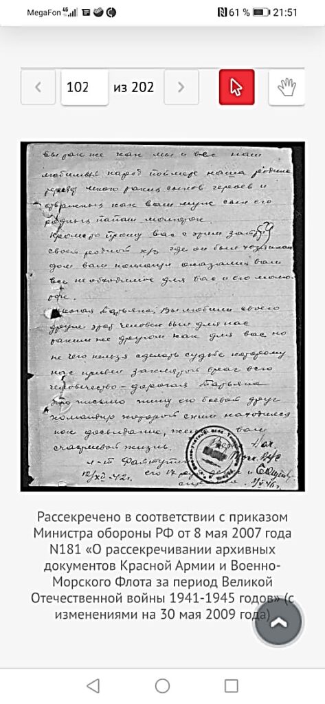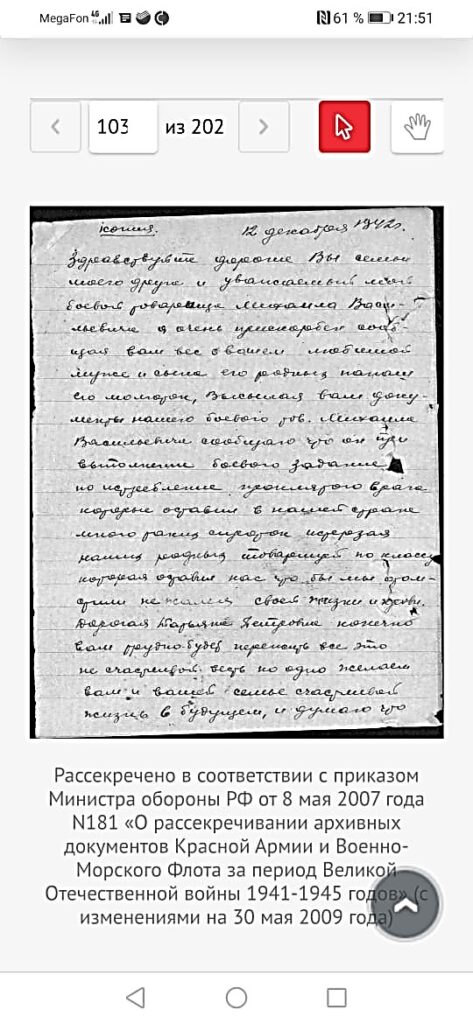 Из письма прапрадедушки: «Обучение ускоренное, здоровье неважное, признали негодным к строевой, таких и людей старше 35 лет не отправляют на фронт 18 августа отправляют на фронт, вместе со мной – многие земляки. Пока держимся вместе. Письма не ждите. Может, вернусь живым и невредимым. Мы все полны решимости разгромить врага. Ждите победы в 1942 году, а моей милой доченьке Ниночке передайте, что папа с «длинноносой Варварой из базара» приедет домой и привезет много подарков». Так он шутил с дочерью, когда она не слушалась и отец пугал длинноносой Варварой. Это было последнее письмо Михаила, больше от него не было никаких вестей.