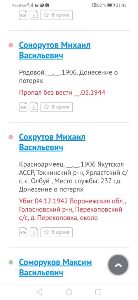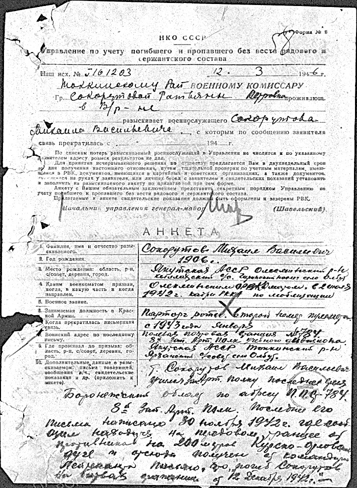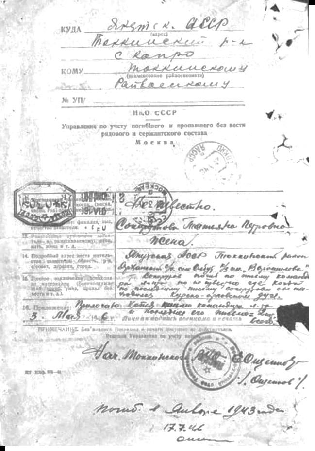 Судя по последнему письму и архивным документам, он погиб под Сталинградом. В начале августа из Челябинска поездом прибыло не менее 300 якутян. Выгрузились около деревни Луговая Пролейка, недалеко от Сталинграда. Михаил Сокорутов, видимо, попал в один из полков 298 стрелковой дивизии и вступил в бой северо-западнее Сталинграда. Это было 7 сентября 1943 г., дивизия приняла тяжелый бой с превосходящими силами противника. В Сталинградской битве погибло 935 якутян, в том числе мой прапрадедушка Михаил Васильевич Сокорутов, доброволец, председатель колхоза «Ворошилов», отец восьми детей. Ему было 38 лет.