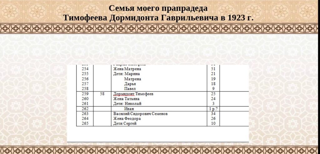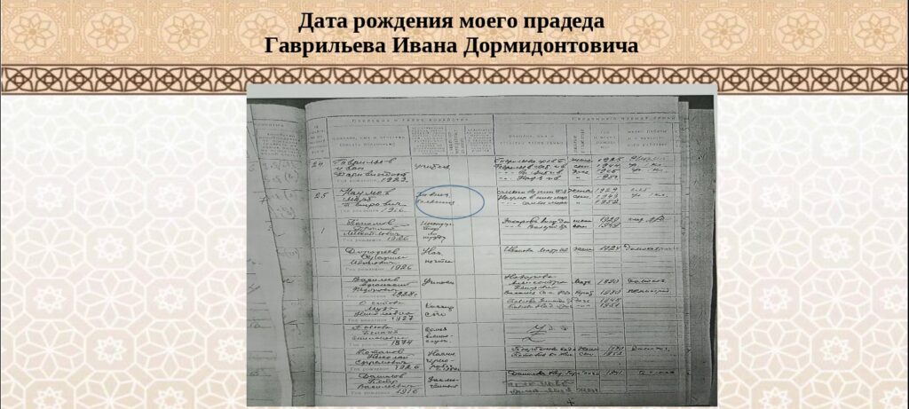 Записи о рождении моего прадеда Ивана Дормидонтовича, были найдены после долгого поиска, так как в 1923 г. метрические книги уже не велись, а похозяйственные книги еще не были заведены, но нам помог копия документа «Спиоск граждан по 2 Нерюктейского наслега, Сунтарского улуса Вилюйского округа» составленный 17.11.1923 г. Оттуда мы узнали, что к 1923 г. отцу семейства моему прапрадеду Дормидонту Гаврильевичу было 25 лет, а ее супруге Татьяне 24 года.