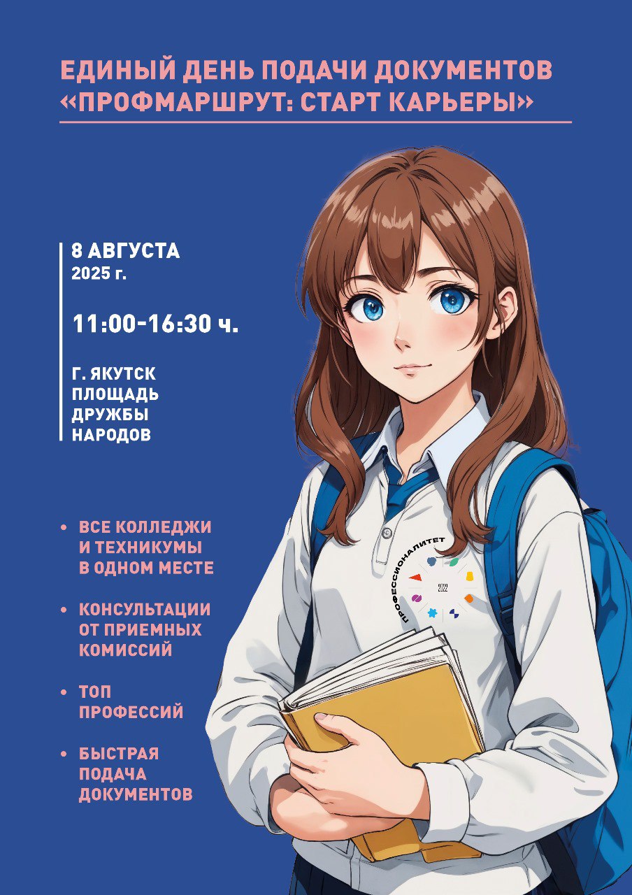 8 августа в г. Якутске состоится масштабное мероприятие для всех будущих студентов – Единый день подачи документов в профессиональные образовательные организации Якутии «ПрофМаршрут: старт карьеры».