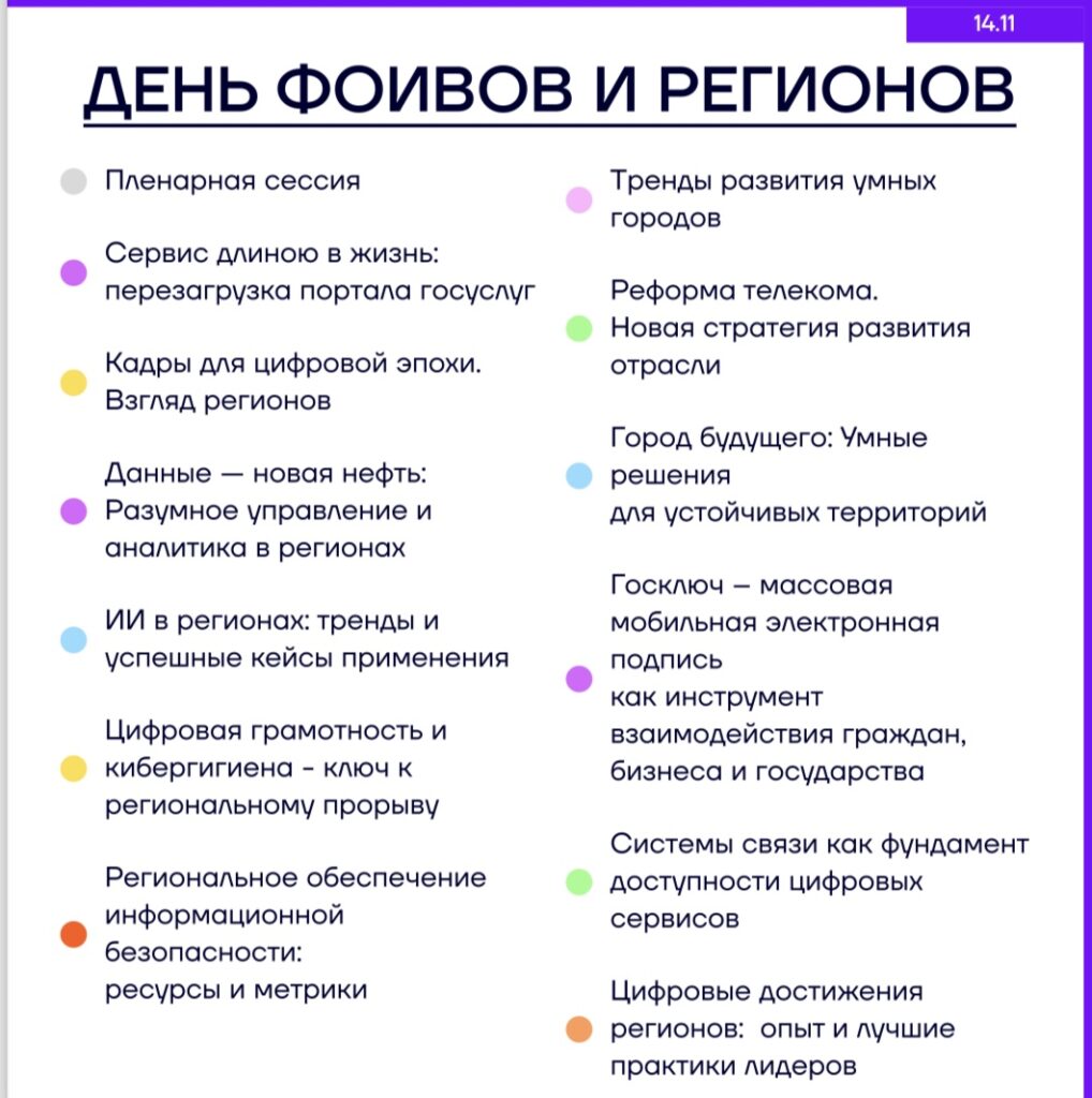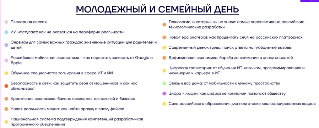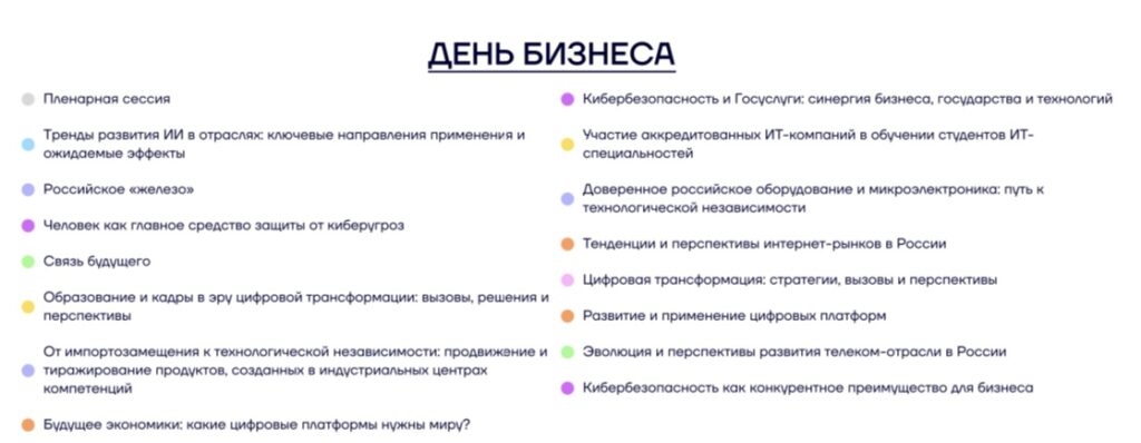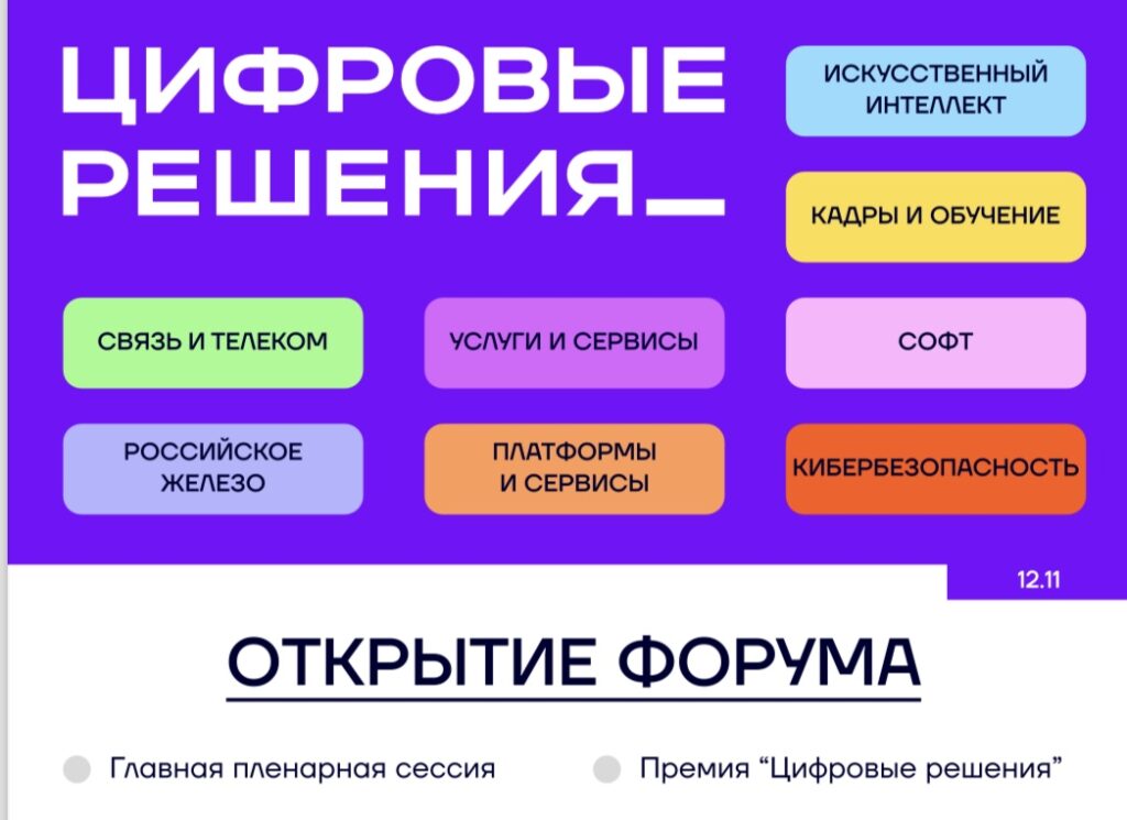 В программе — более 90 сессий с участием свыше 600 спикеров. Темы охватывают связь и телеком, государственные услуги, отечественное ПО и оборудование, искусственный интеллект, платформы и сервисы, кибербезопасность, подготовку кадров и образование.