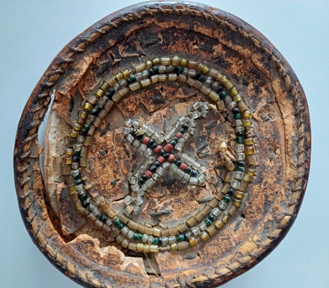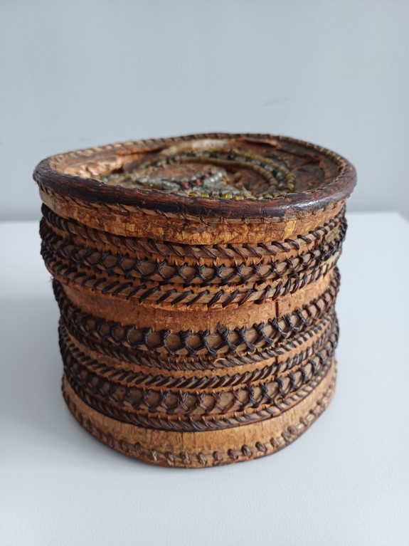 Размер шкатулки: высота без крышки – 8 см; диаметр горловины – 11 см; диаметр поддона – 13 см. На крышке есть разрыв по краю шва, украшена бисером – узор в виде креста. Есть петля из ровдуги.