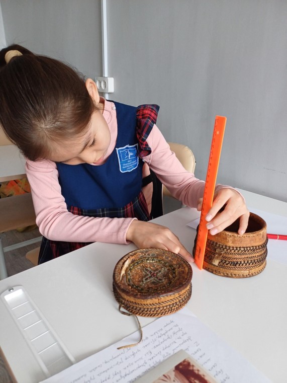 В нашем музее разновидность таких шкатулок очень много, есть и деревянные, и берестяные. Берестяных шкатулок в фонде музея оказалось больше. Шкатулка моей прапрапрабабушки оказалась самой маленькой по размеру, высота – 8 см. Шкатулка была изготовлена из бересты, конского волоса, тальника. В отличие от других, крышка шкатулки моей бабушки украшена бисером. Это главное ее отличие и уникальность.