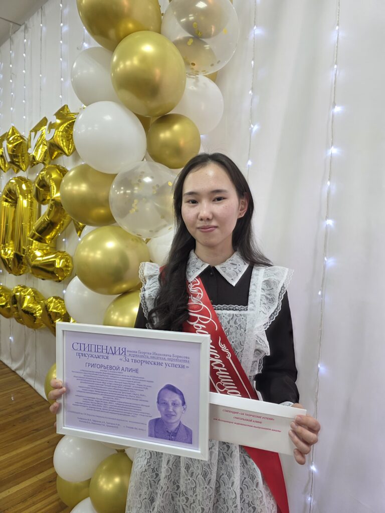 Алина Григорьева, ученица 11 класса 2 Мальжагарской СОШ им. М.Е.Васильевой, юнкор медиацентра, стипендиат имени Г.И.Борисова, журналиста, переводчика, писателя, от ассоциации журналистов с.Улахан-Ан «За творческие успехи»