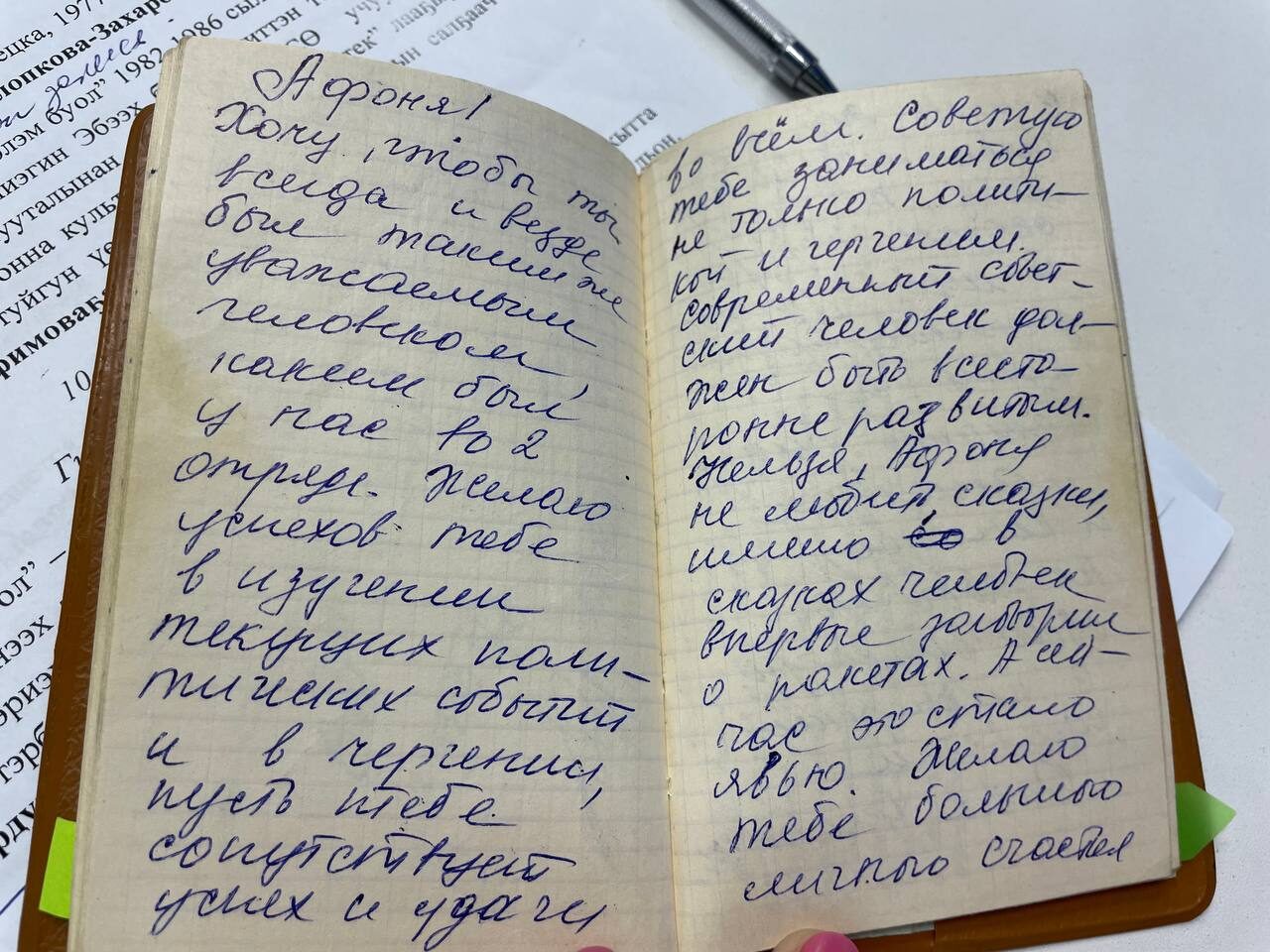 Афоня! Хочу, чтобы ты всегда и везде был таким же уважаемым человеком, каким был у нас во 2 отряде. Желаю тебе в изучении текущих политических событий и в черчении, пусть тебе сопутствует успех и удачи во всем. Советую тебе заниматься не только политикой и черчением. Современный человек должен быть всесторонне развитым. Нельзя, Афоня, не любить сказки, именно в сказках человек впервые заговорил о ракетах. А сейчас это стало явью. Желаю тебе большого личного счастья, успехов. Желаю тебе любить музыку, танцы, сказки, спорт и еще гордиться званием АРТЕКОВЕЦ и стать дипломатом, и конечно не забывать свою вожатую. С пионерским приветом Ольга Оскаровна.