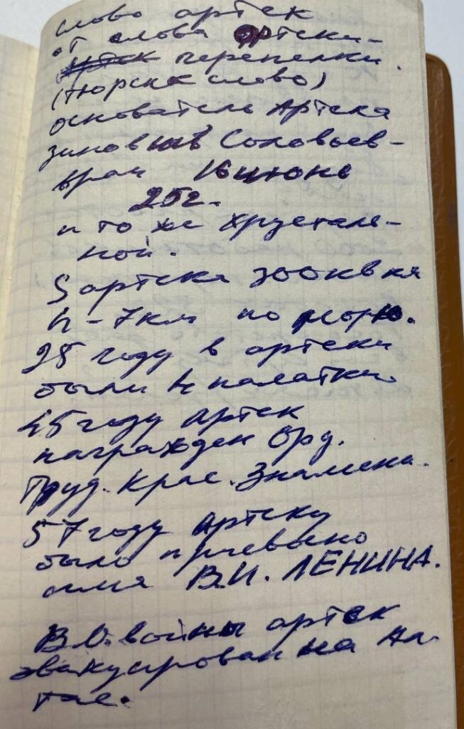 Афанасий Васильевич блокнотугар “артек” диэн бу тюрк тыла буоларын туһунан бэлиэтэммит уонна салгыы “Артек” лааҕыр туһунан суруйбут: “Основатель Артека Зиновий Соловьев – врач, 16 июня 1925 г. Площадь “Артек” 300 кв км, ширина – 7 км по морю.В 1925 году в Артеке было 4 палатки, в 1945 году награжден орденом Трудового Красного Знамени. В 1957 году Артеку было присвоено имя В.И. Ленина. Во время Отечественной войны Артек эвакуирован на Алтае. В Артеке работает 2000 работников. Вожатых 320. Государство дает в год Артеку 26 тысяч рублей”.