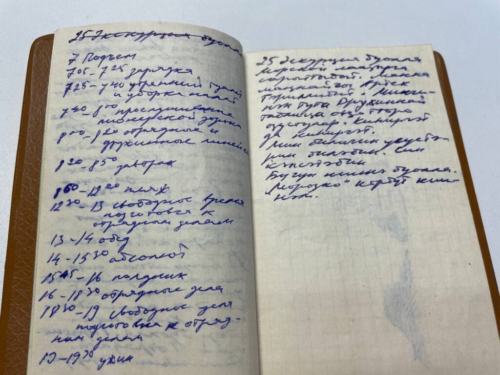 Афанасий Васильевич бу көрсүһүүгэ Артек расписаниетын блокнотугар суруммутун араас кэм артековецтарыгар ааҕан иһитиннэрбитин бары астына иһиттилэр, “Артекка” атаарбыт оҕо саастарын дьоллоох кэмнэрин санаан ыллылар: «7 – подъем. 7.05-7.25 – зарядка. 7.25 – 7.40 – утренний туалет и уборка. 7.40-8.00 – прослушивание пионерской зорьки. 8.00-8.20 – отрядные и дружинные линейки. 8.20-8.50 – завтрак. 8.50-12.00 – пляж. 12.30-13 – свободное время, подготовка к отрядным делам. 13-147 – обед. 14-15.30 — абсолют. 15.45-16 – полдник. 16-18.30 – отрядные дела 18.30-19 — свободные дела, подготовка к отрядным делам. 19-19.30 – ужин».