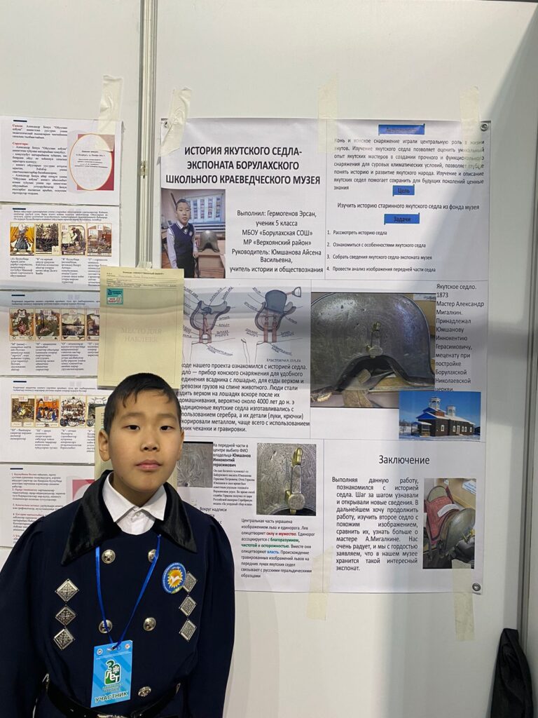 Эрсан Гермогенов, V кылаас, Боруулаах орто оскуолата, Үөһээ Дьааҥы: «Дорооболоруҥ! Мин үлэм аата «История якутского седла-экспоната Борулахского школьного краеведческого музея» диэн. Бу ыҥыыр Юмшанов Иннокентий Герасимович диэн Боруулаахха баар Николаевскай таҥара дьиэтин туттарбыт киһиэхэ анаан 1873 сыллаахха оҥоһуллубут, маастар Александр Мигалкин эбит. Бу ыҥыыр уратытынан кини киэргэлэ буолар. Саха сиригэр оҥоһуллубут эрээри хахай уонна единорог уруһуйдаах. Бу уруһуйдары нуучча геральдическэй уобарастарын кытта сибээстииллэр. Бу үлэбин салгыы үөрэтэр былааннаахпын, ону таһынан түмэлбитигэр эмиэ атын да ураты экспонаттар бааллар».