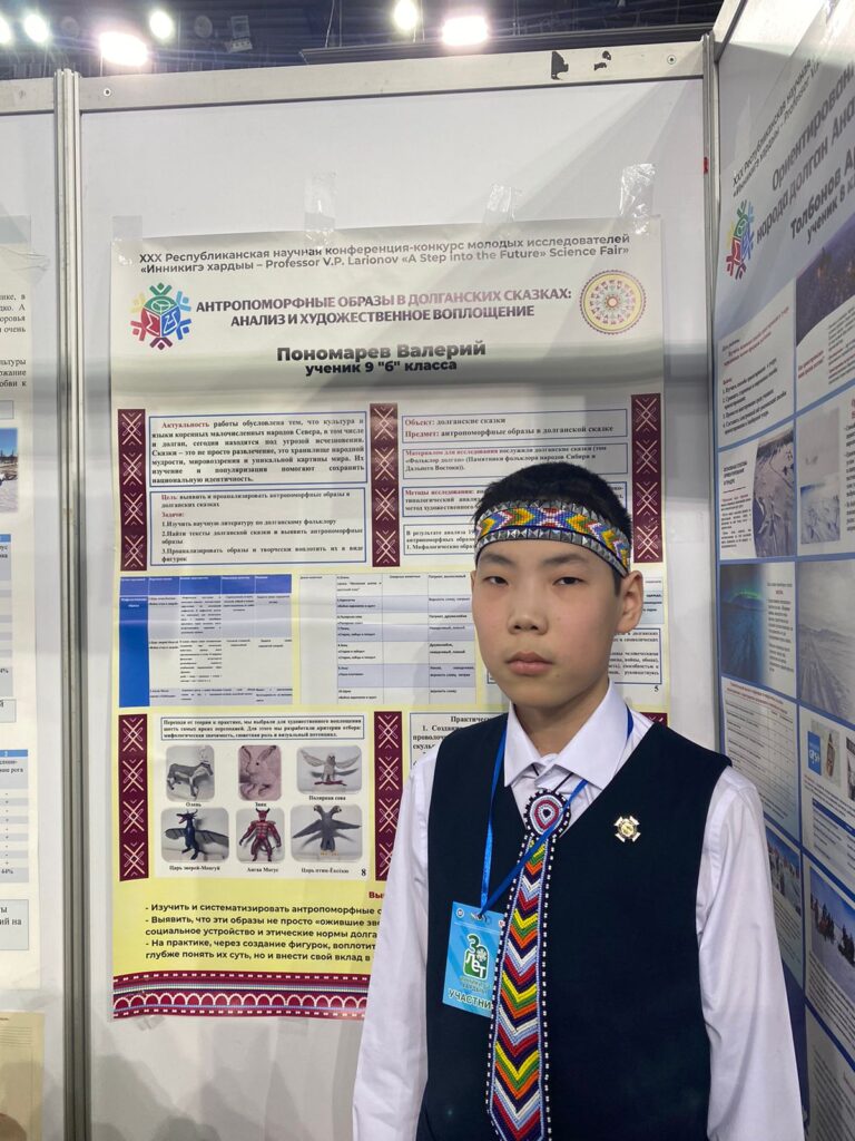 Валерий Понамарев, IX кылаас, Сааскылаах орто оскуолата, Анаабыр: «Мин үлэм аата «Антропоморфные образы в долганских сказках: анализ и художественное воплощение» диэн. Бу үлэбин аҕыйах ахсааннаах хотугу омуктар ол иһигэр долган омук култууратын үйэтитэр сыаллаах оҥордум. Бу үлэбэр долган омук остуоруйаларыгар баар киһитийбит кыыллары үөрэттим. Холобура, Монгуй – бары кыыллар ыраахтааҕылара (дракон уобараһынан ойууланар), Ангаа Моҕус – биир харахтаах, сүүнэ улахан уҥуохтаах, дьоҥҥо буортуну оҥорор харамай, Өксөкү – икки төбөлөөх хотой, күөх халлаан ыраахтааҕыта, Хаар Эбэ – остуоруйаларга муударас эбэтэр ойуун уобараһа, Куобах – сорох остуоруйаларга ойуун буолар, Таба – сүрүн дьоруой бастыҥ доҕоро, көмөлөһөөччүтэ буолаллар. Бу персонажтары скульптурнай пластелинынан оҥорбутум».