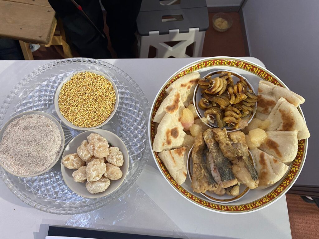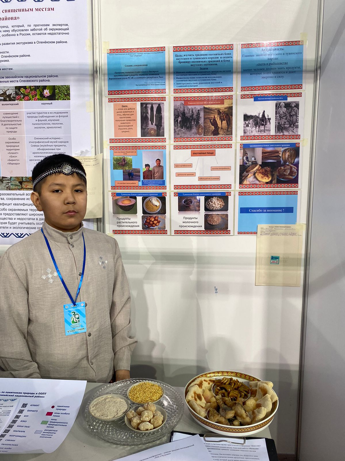Иннокентий Бегишев, VIII кылаас, Эҥэ орто оскуолата, Үөһээ Дьааҥы: «Үтүө күнүнэн! Мин үлэм аата «Продукты питания быстрого и длительного приготовления в рационе охотника Республики Саха (Якутия) и Республики Тыва» диэн. Мин аҕам балыгынан, булдунан дьарыгырар. Ону таһынан, учууталым, салайааччым Копуш Дарима Аясовна уонна биһиги оскуолабыт суоппара Тываттан сылдьаллар. Ол иһин бу тиэмэни интэриэһиргээн талбытым. Булчут аһыыр аһа ыйааһына чэпчэки, элбэх миэстэни ылбат, өр буорту буолбат уонна калорийнай ол эбэтэр, элбэх күүс-уох биэрэр буолуохтаах. Саха булчутун аһыгар киирэллэр: сахалыы лэппиэскэ, хатарыллыбыт балык (дьуухала), балык искэҕэ. Онтон Тыва булчутун аһа: тыва талкан (ыһаарыламмыт бурдук куруппата), тара, чокпек, хаппыт балык, курут (хатарыллыбыт аһытыллыбыт үүт) буолар. Булчут күҥҥэ иккитэ аһыыр – сарсыарда уонна киэһэ. Мин бу үлэбин бэйэбит уонна аймахтыы омуктарбыт култуураларын билиһиннэрээри оҥордум».