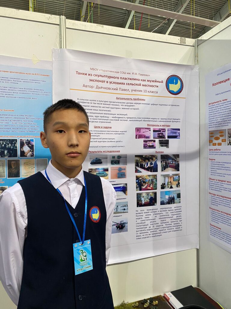 Павел Дьячковский, X кылаас, И.М. Павлов аатынан Чурапчы орто оскуолата, Чурапчы: «Мин үлэм аата « Танки из скульптурного пластилина как музейный экспонат» диэн. Бу үлэ сүрүн быһаарар кыһалҕатынан тыа сирин түмэллэригэр дьиҥнээх таанкалар экспонат быһыытынан суохтара буолар. Ол оннугар, маннык скульпурнай пластелинынан оҥоһуллубут макеттар бэйэлэрэ туспа экспонат буолуохтарын сөп. Бу холобура, «Алеша» Танк аатырбыт киирсиитин оҥордум. Үлэбэр сүрүн туһанар матырыйаалым скульптурнай пластелин буолар. Бу матырыйаал өҥүн, форматын үчүгэйдик тутар, итиигэ ууллубат».