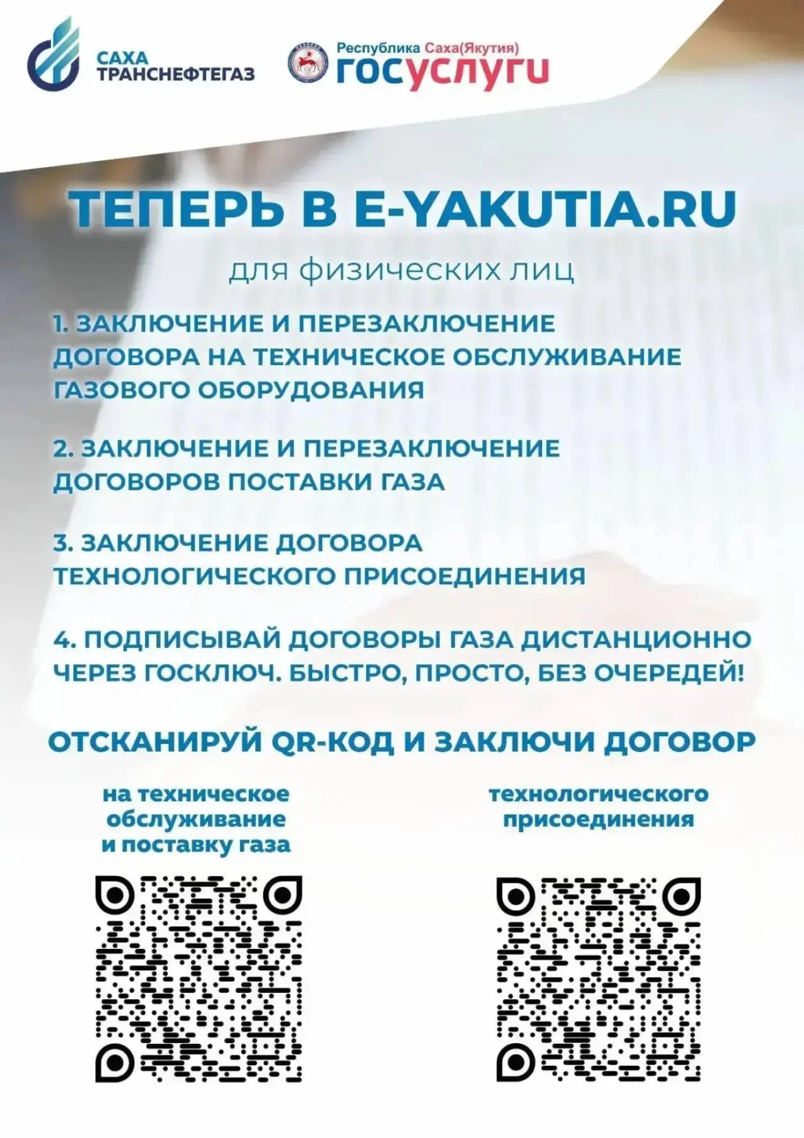 АО «Сахатранснефтегаз» расширяет цифровые возможности для абонентов, переводя ключевые услуги в онлайн-формат. Теперь оформить необходимые документы можно через региональный портал e-yakutia.ru, а подписать договоры — дистанционно с помощью мобильного приложения «Госключ», без необходимости посещения офисов.