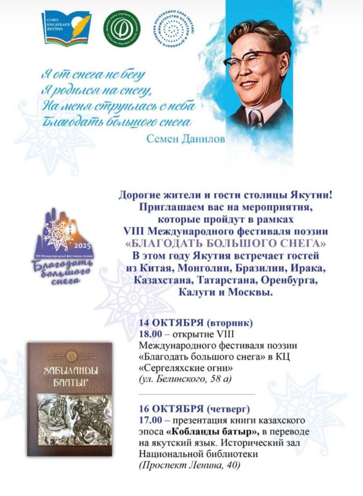 VIII Международный фестиваль поэзии «Благодать большого снега» соберет участников из Китая, Монголии, Бразилии, Ирака, Казахстана, также из регионов России — Татарстана, Оренбурга, Калуги и Москвы.