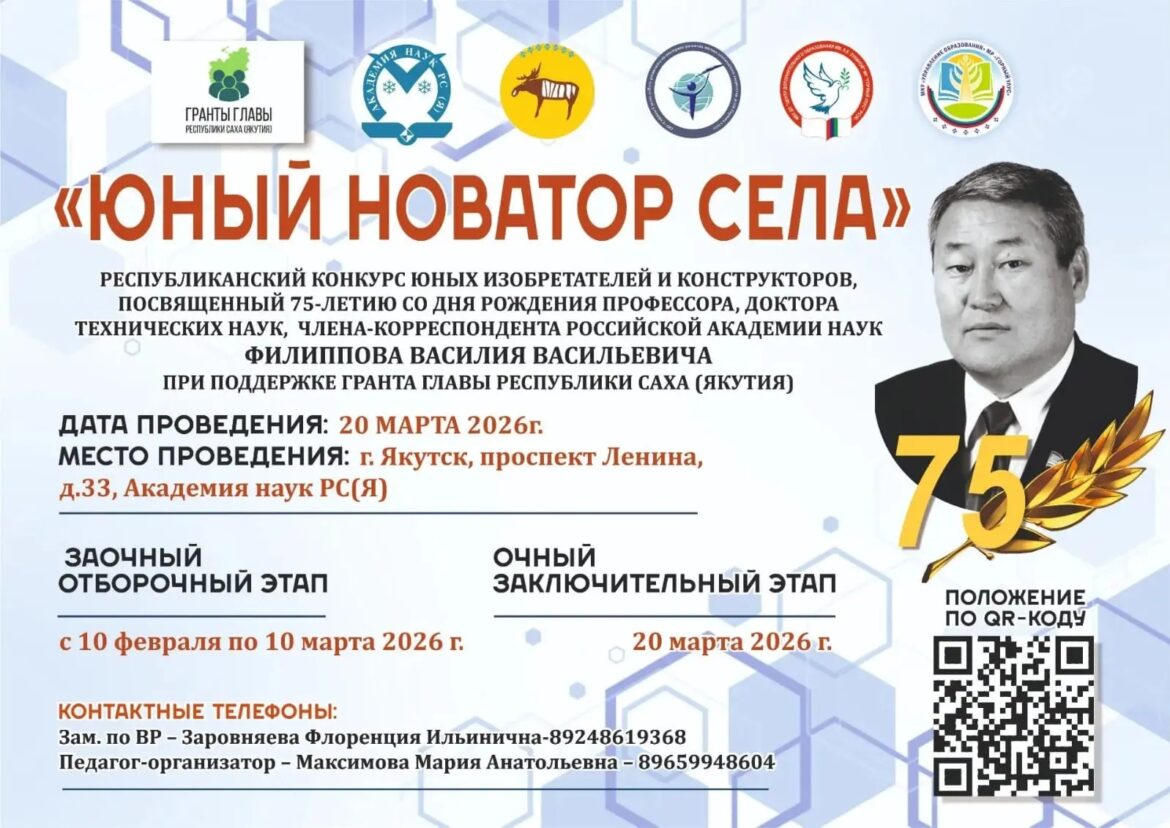 20 марта в Якутске состоится республиканский конкурс юных изобретателей и конструкторов «Юный новатор села», посвященный 75-летию профессора, доктора технических наук, академика Академии наук РС (Я), члена-корреспондента Российской академии наук Василия Васильевича Филиппова.