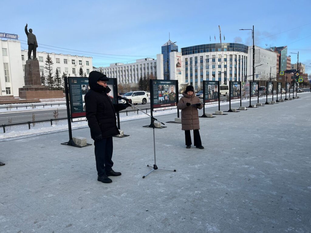 «Дорогие земляки, несмотря на мороз мы собрались здесь для того, чтобы участвовать в открытии выставки. Эта выставка создана по инициативе Российского военно-исторического общества. Хочу поблагодарить всех тех, кто принимал участие в создании этой выставки. За то, что выбрали именно это место. Именно здесь проходят много наших горожан. Сегодня утром, когда шел на работу я видел как люди подходили и внимательно читали стенды на которых есть фотографии Героев нашей Якутии, Героев Великой Отечественной войны, Героев Специальной военной операции. Это как раз говорит о связи многих поколений. Сегодня наши бойцы, воины продолжают героический путь своих предков, воинов победителей Великой Отечественной войны.