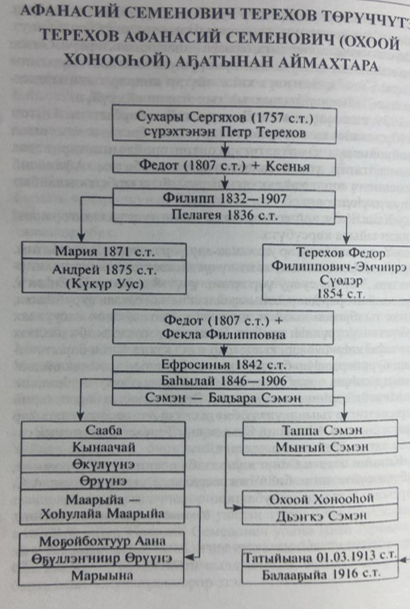 Я представитель рода Тереховых из с. Кобяй. Первым крещёным из нашего рода был Пётр Терехов (1757), до этого его звали Сухары Сергяхов. Об этом узнали из генеалогической схемы рода Онорхой, которую составил известный генеалог, наш земляк, кандидат физико-математических наук Марк Петрович Григорьев.