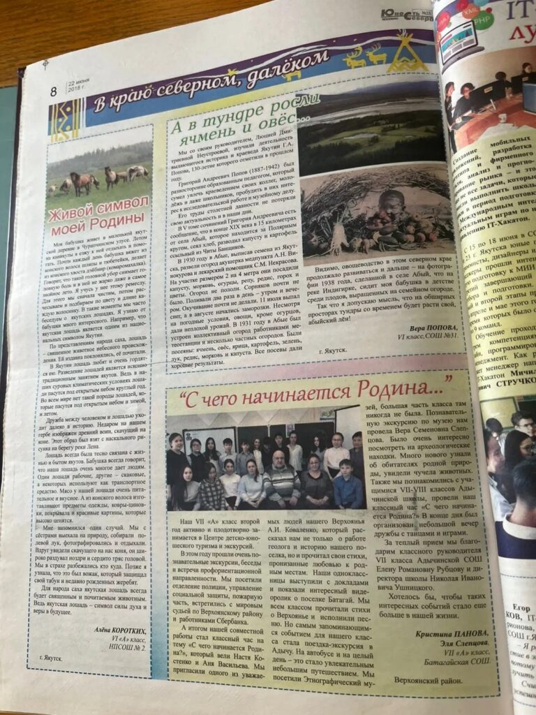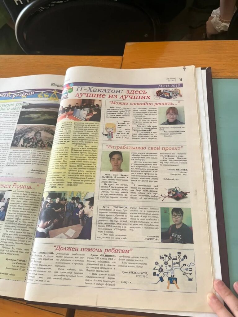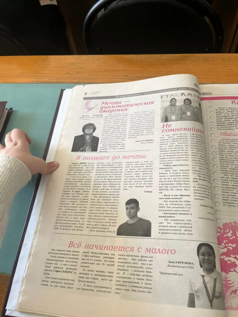 Прежде всего, интересен пример Йолы Бродниковой, уроженки с. Саскылах, которая в 2022 г. представила замечательный проект – палиндромы (слова, которые могут читаться наоборот, сохраняя произношение и смысл) народов Якутии. Она систематизировала слова-«перевёртыши» долганского, эвенкийского и якутского языков. Это очень полезная работа, необходимая для сохранения наших северных языков. В интервью журналу «Юность Севера» Йола отметила, что хотела бы создать слуховые аппараты с синхронным переводом русского на якутский, при этом добавляя всё больше новых языков. First of all, the example of Yola Brodnikova, a native of Saskylakh village, is particularly interesting. In 2022, she presented a remarkable project on the palindromes (words that can be read backward while preserving pronunciation and meaning) of the peoples of Yakutia. She systematized the «reversible» words of the Dolgan, Evenki, and Yakut languages. This is highly valuable work, essential for the preservation of Northern languages. In an interview with the Yunost Severa (Youth of the North) magazine, Yola noted that she would like to create hearing aids with synchronous translation from Russian to Yakut, with the possibility to add more and more new languages over time.