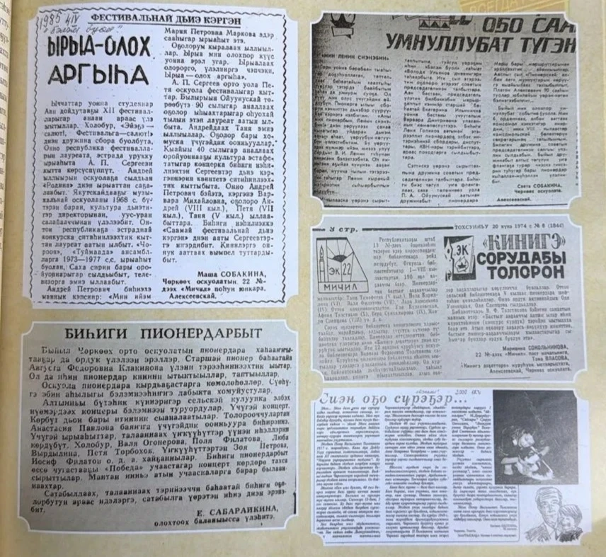 — Мин чуолкайын соччо өйдөөбөппүн. Арааһа 6 кылааска үөрэнэ сылдьан тахсыбытым буолуо дии саныыбын. Таатта улууһугар (уруккута Алексеевскай оройуон диэн) П.А.Ойуунускай аатынан Чөркөөх орто оскуолатыгар үөрэнэр кэмнэрбэр этэ.