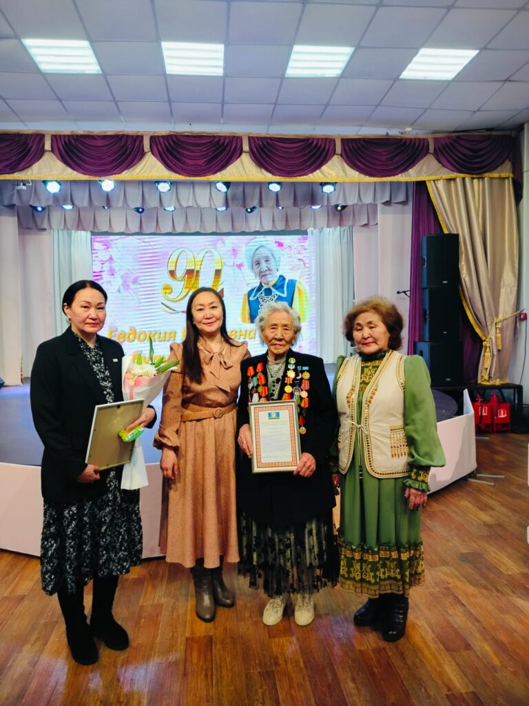 Нэһилиэкпит баһылыгын солбуйааччыта Айталина Алларитовна Кириллина «Нэһилиэк киэн туттуута» анал бэлиэни туттарда. Улуустааҕы бэтэрээннэр сэбиэттэрин бэрэссэдээтэлэ Мария Романовна Захарова эҕэрдэлээн туран, Евдокия Егоровна олоҕун аргыһын Николай Егорович Захаровы кытта 47 сыл эйэ-дэмнээхтик олорон ааспыттарын, нэһилиэк общественнай олоҕор көхтөөхтүк кытталларын, кинилэр дьоллоохтук олорон оҕолорун, сиэттэрин үлэҕэ сыһыаран, олох сыаннастарын иҥэрэн, сирдээҕи улахан аналларын чиэстээхтик толорбуттарын туһунан бэлиэтээн эттэ. Улуустааҕы социальнай харалта управлениетын начальнига Любовь Ивановна Дорофеева ытык киһибит 100 сааһыгар диэри тиийэригэр баҕа санаатын тиэртэ.